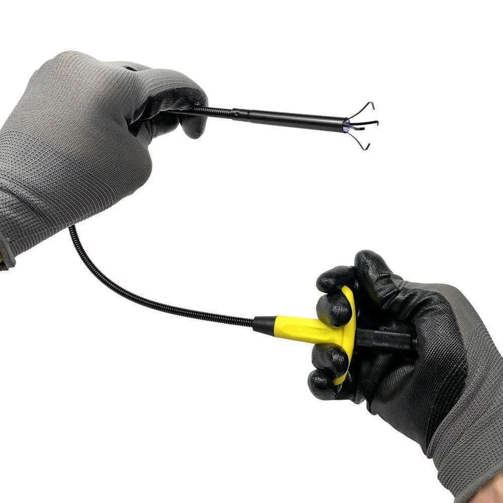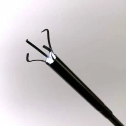- Continued push opens four-prong spring steel retrieval claw
