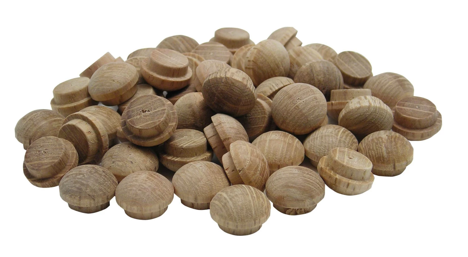 When #311038 3/8 In. Oak Round Head Plugs are glued into screw holes, they protrude slightly above the surface, creating a decorative look in furniture and woodworking applications.