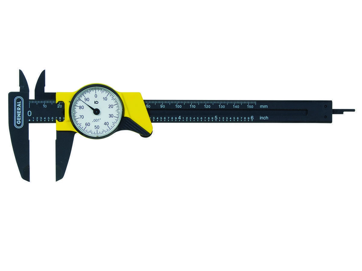 The #145 6 In. Plastic Dial Caliper, Single Revolution can make inside, outside, depth and step measurements in inches or millimeters.