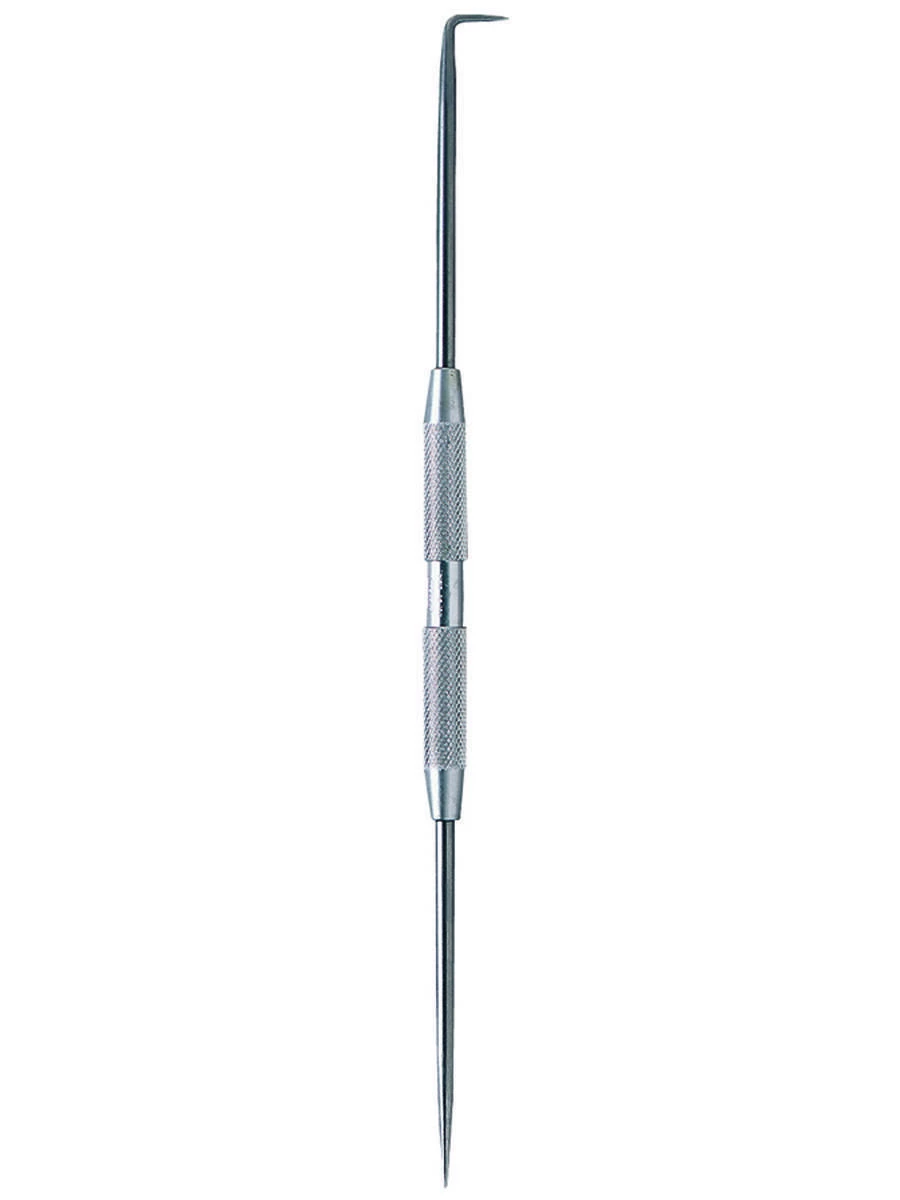 - Aluminum body with knurled finger grip and two fixed, hardened and ground steel points: straight and 90°