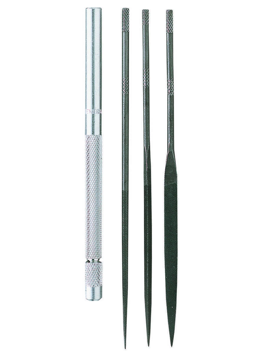 The #S477 Four-piece Tool Steel Needle File Set with Handle is ideal for craftspersons and hobbyists.