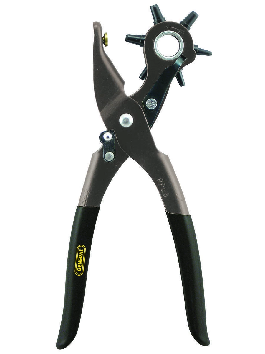 The Revolving Punch Pliers are ideal for making miniscule punch holes that would not be practical with a single-style punch. The revolving turret offers six distinct punch sizes for use on leather, rubber, plastic and similar materials. This tool is commonly used around the home for hobbies and crafts, or for adding additional holes to a leather belt.