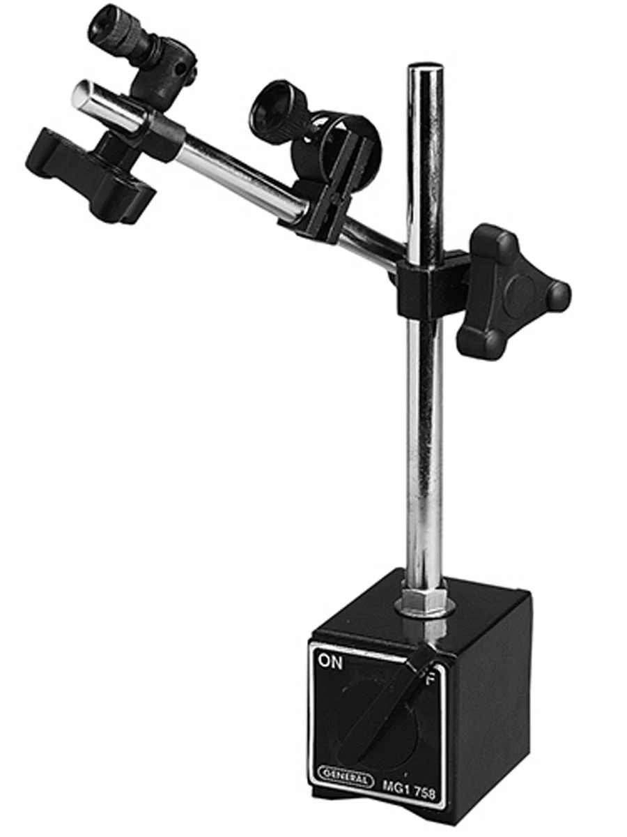 The #MG1758 Magnetic Base can hold most dial indicators with center lug backs, universal indicator attachments, as well as other fixtures.