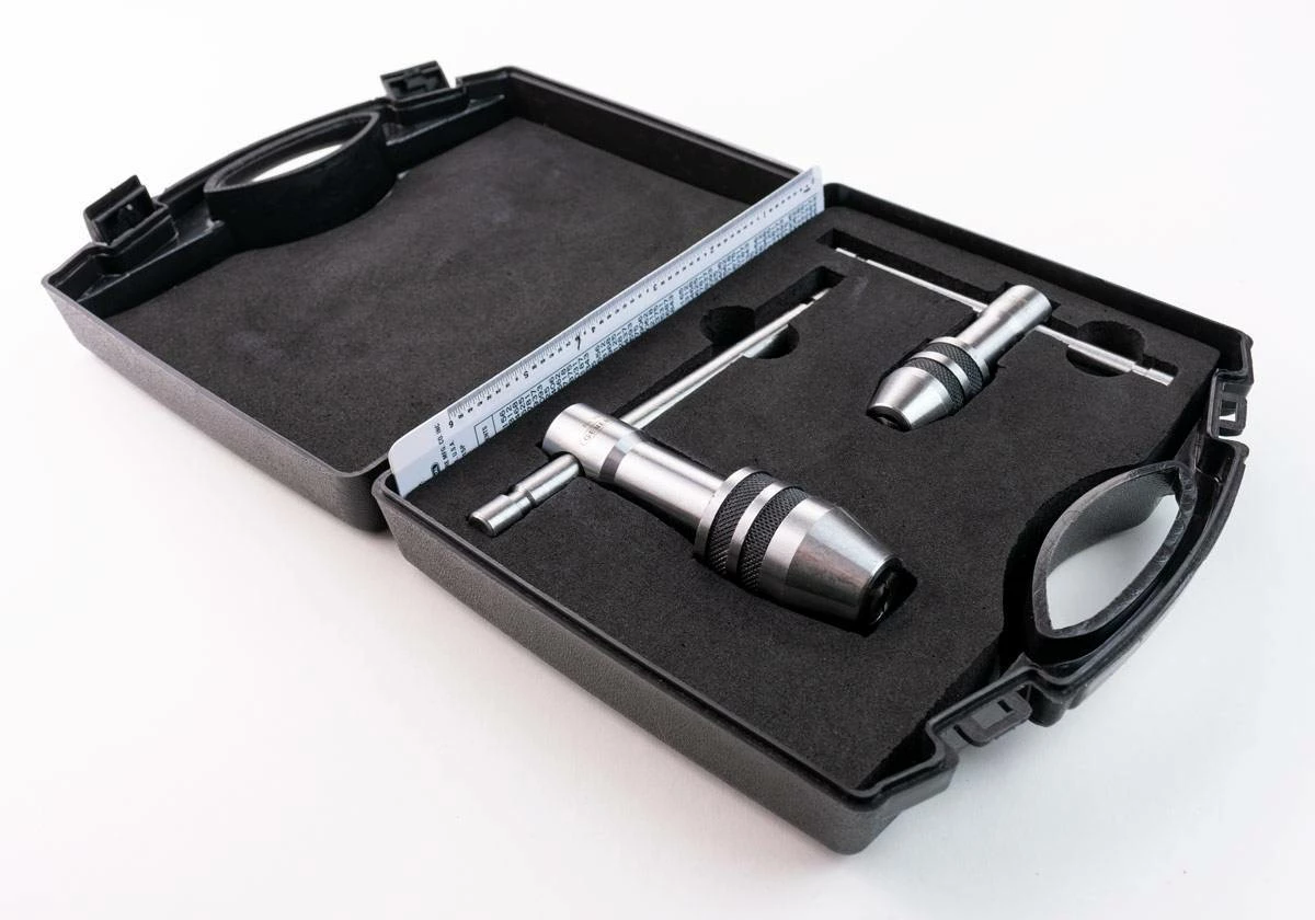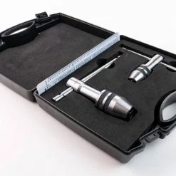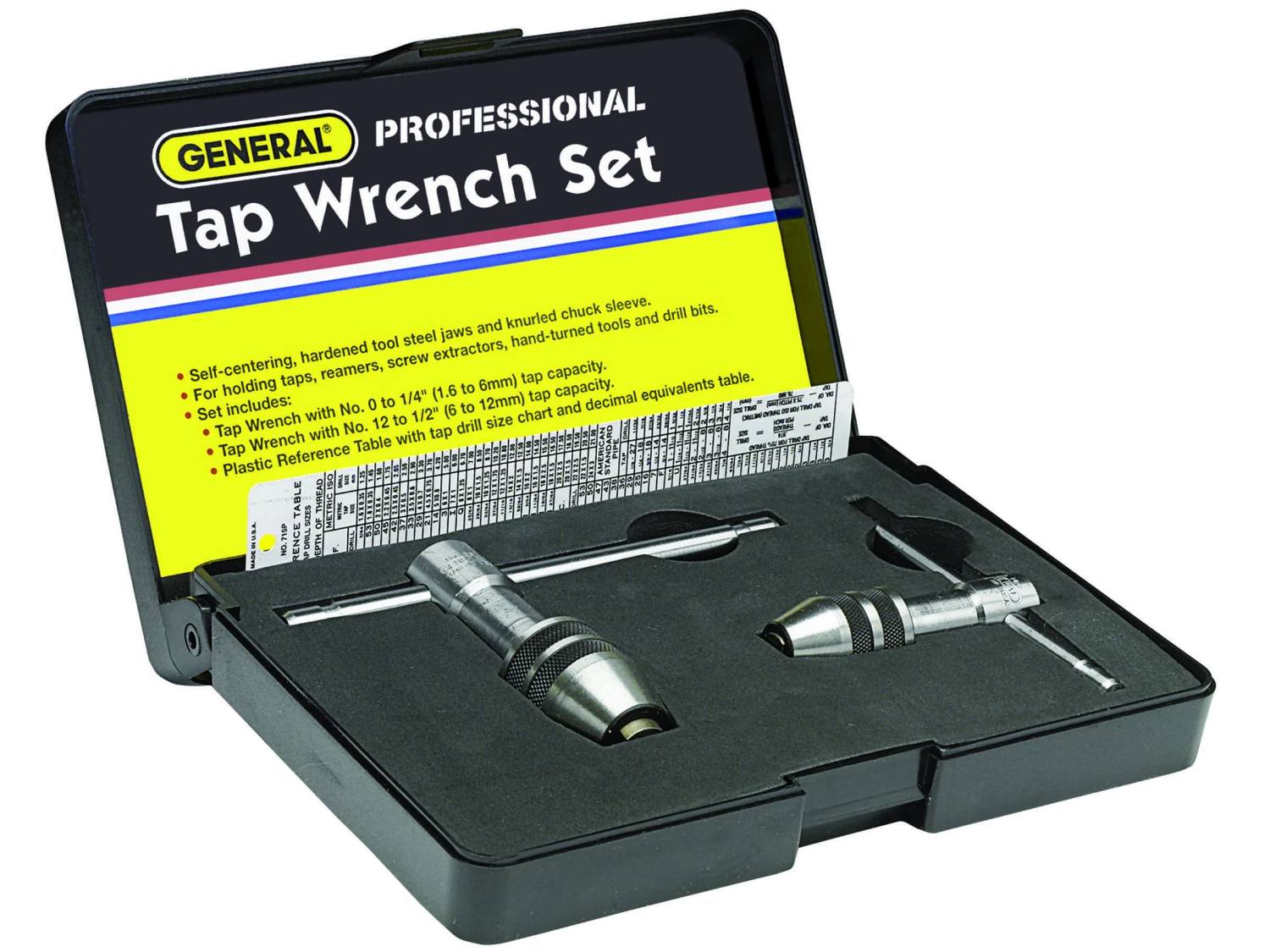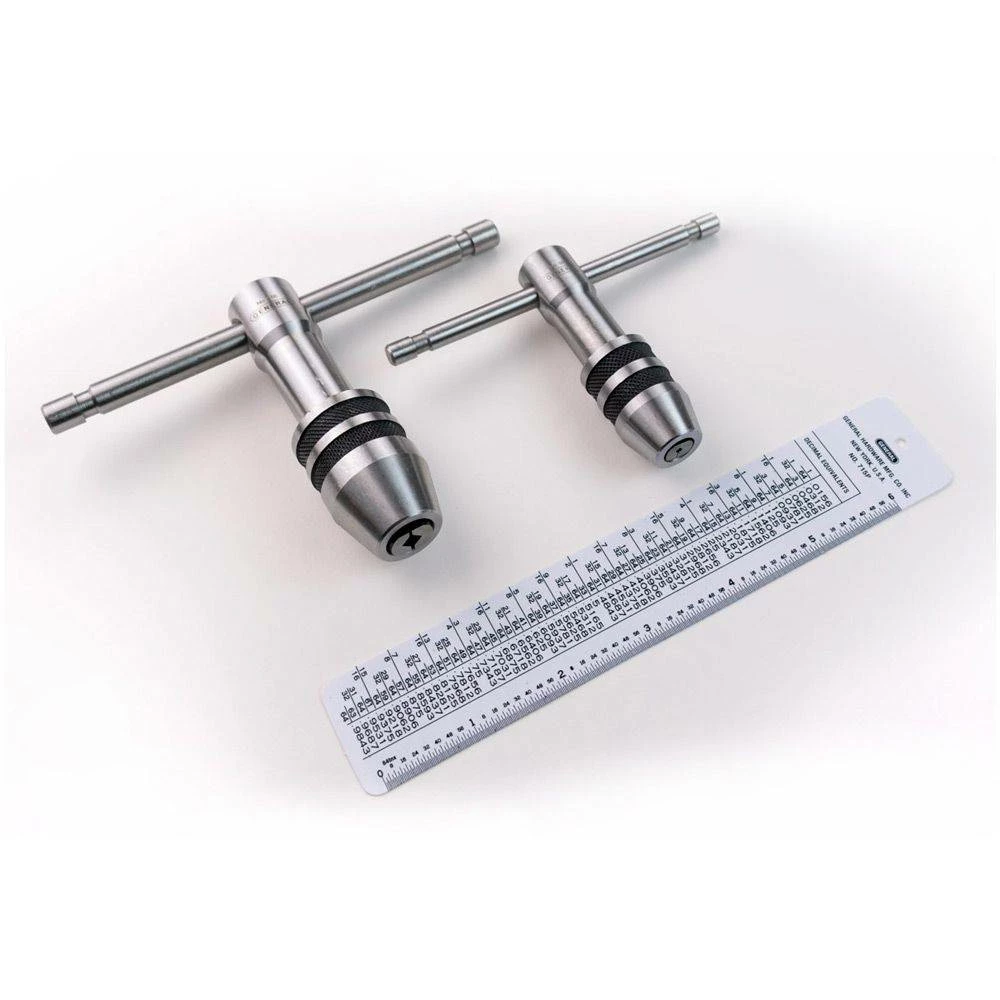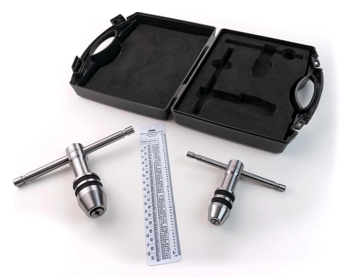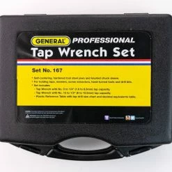 The 167 Professional Tap Wrench Set is perfect for creating straight and accurate thread holes in your work pieces. The two-piece set includes General Tools 164 Tap Wrench for No. 0 to 1/4 In. taps and the General Tools 166 Tap Wrench for No. 12 to 1/2 In. taps. Great for mechanics, machinists and maintenance professionals, these tap wrenches have sliding T-handles that provide a large gripping surface while allowing ideal maneuverability and leverage in tight spaces. The hardened steel jaws have a self-centering chuck with a knurled chuck sleeve for a secure grip. Taps are designed to hold and turn taps—tools that cut threads on the inner surface of a hole or pipe—or other small tools, such as hand reamers, drill bits, screw extractors and other hand-turned tools. Also included is a durable plastic reference guide featuring a machine screw size tap drill chart for recommended 75% depth thread on the front and a decimal equivalents table in 64ths from 1/64″ to 63/64″ on the back. All pieces come packaged in a fitter, foam-lined plastic case.
