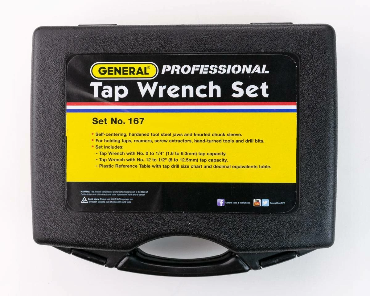 - TWO PIECE SET- Set includes General Tools 164 Tap Wrench for No. 0 to 1/4 In. taps and 166 Tap Wrench for No. 12 to 1/2 In. taps