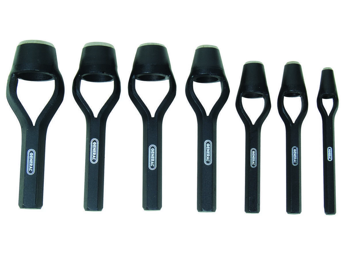 The #1271ST Seven-piece Arch Punch Set is ideal for punching round holes in gasket material, leather, rubber, canvas, cardboard, plastic, sheet metal and other soft materials.